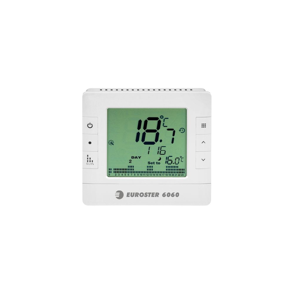 Regulator termperatury Euroster 6060 przewodowy regulator temperatury do wszelkich urządzeń grzewczych. Duży, czytelny i podświetlany wyświetlacz, z trzema poziomami temperatury: komfortowa, ekonomiczna, obniżona, szereg użytecznych funkcji.