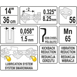 Długość 14", 56 ogniw, podziałka 0,325", szerokość 0,058" (1,5 mm).