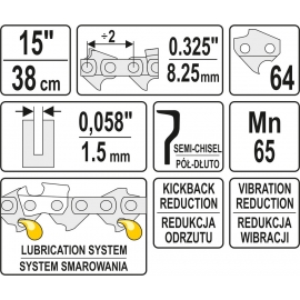 Długość 15", 64 ogniw, podziałka 0,325", szerokość 0,058" (1,5 mm).