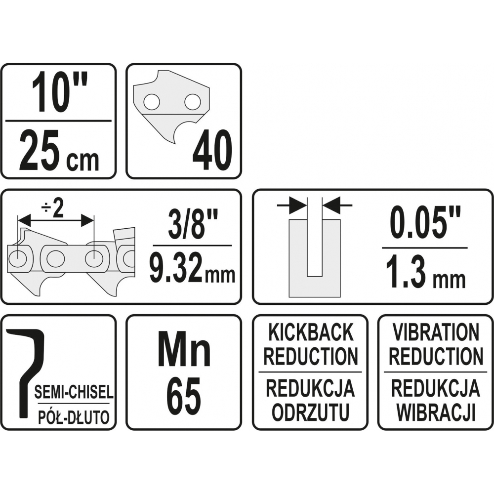 Długość 10", 40 ogniw, podziałka 3/8", szerokość 0,05" (1,3 mm).