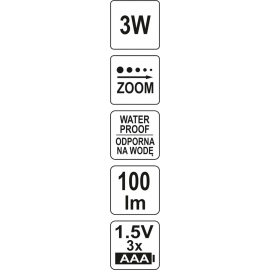 funkcja zoom z soczewką PMMA umożliwiająca zmianę skupienia wiązki światła i oświetlanie przedmiotów oddalonych nawet o 100 m)