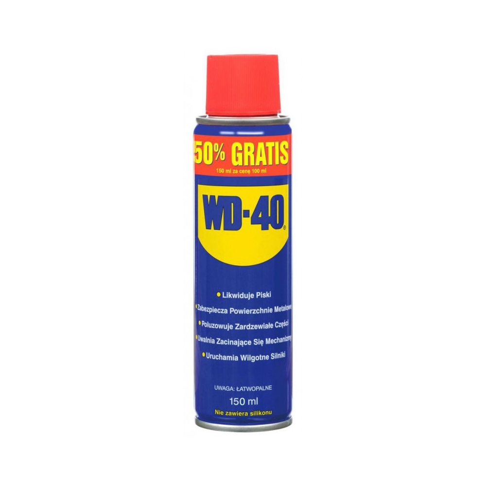 Doskonały do usuwania wody - zapewnia niezwykle silne właściwości przywierania do metali. W pełni pokrywa powierzchnie, przenika pod warstwę wilgoci tworząc barierę ochronną pomiędzy wodą i metalami. Jest doskonałym izolatorem i szybko eliminuje spięcia spowodowane wilgocią. WD-40 rozprowadza czynniki antykorozyjne na całej powierzchni pokrytego przedmiotu, łącznie z mikroskopijnymi nierównościami. Precyzyjnie wysusza pokrywaną powierzchnię, eliminując mikroskopijne krople, które są często przyczyną korozji. Precyzyjnie dostaje się pod warstwę brudu, tłuszczów, smarów i olejów, czyszcząc spryskana powierzchnię. Rozpuszcza większość materiałów samoprzylepnych, ułatwiając usuwanie nalepek i innych klejących zabrudzeń.