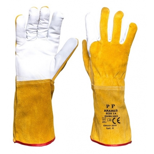 - rękawice robocze, ochronne, wykonane z wysokiej jakości skóry koziej, licowej