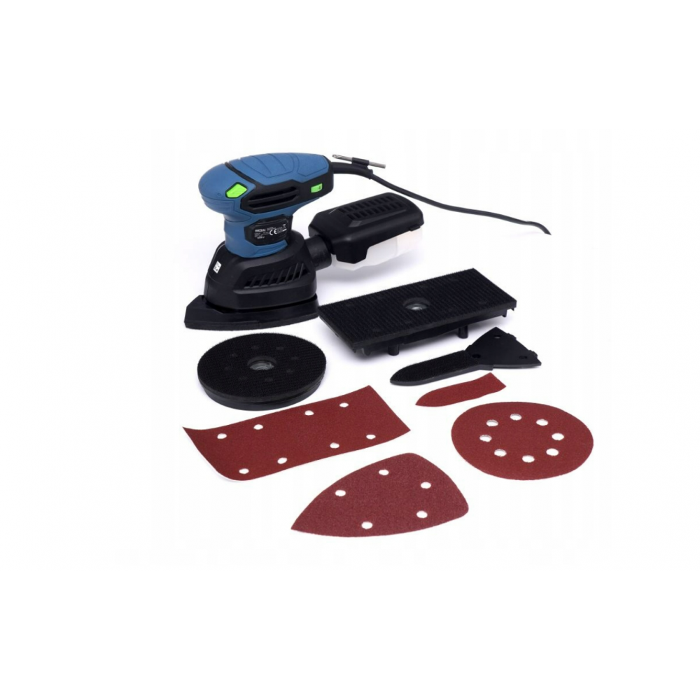 - Wymiana papieru ściernego odbywa się bez narzędziowo, tarcze są mocowane na rzep. W zestawie znajduje się również worek na pył, dzięki czemu praca jest czysta.